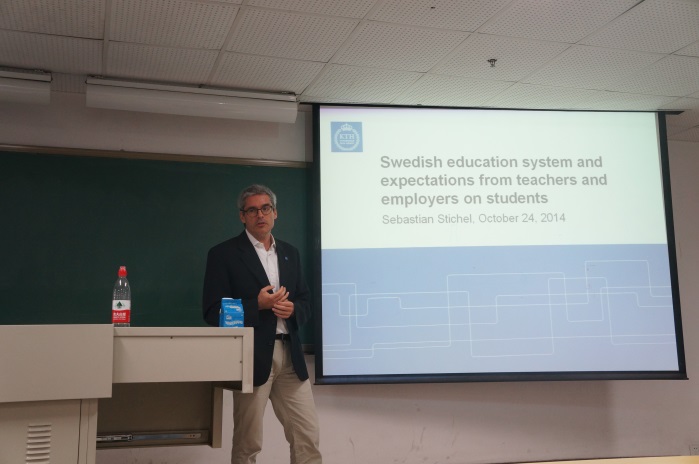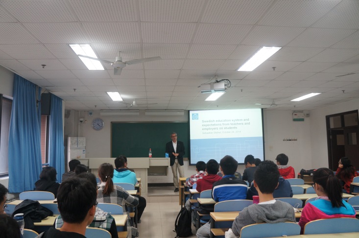 围绕着“瑞典的教育制度、老师和雇主对学生的期望”等内容,Sebastian教授结合着PPT用自己绘声绘色的语言,以及生动有趣的事例,深刻的讲述了瑞典学生应完成的学业和怎样的学生才是老师和雇主所期望的。讲座现场,座无虚席,Sebastian教授所讲十分实用,受到了同学们的一致欢迎。最后在同学们的热情提问以及Sebastian教授的精心讲解下结束了这次的讲座。